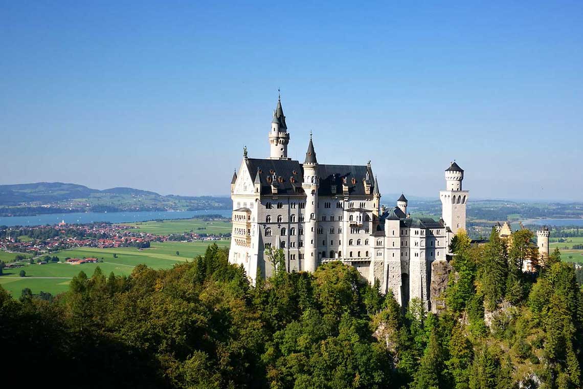 Neuschwanstein castle is about 90 minutes from Munich by car, or two hours by train or bus. Our private tours by car to Neuschwanstein castle include up to as many as 7 stops at other significant points of interest which usually include the following: 2 stops in Garmisch-Partenkirchen, the renowned village of Oberammergau, the impressive Basilica at the Ettaler Abby, Linderhof Palace, Plansee in Austria, and of course Neuschwanstein castle in Hohenschwangau.